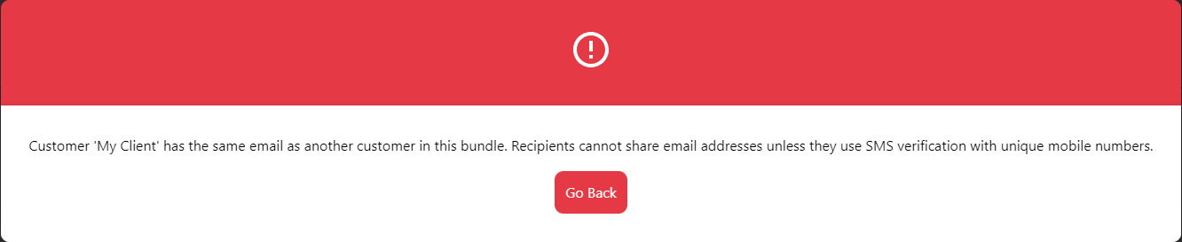 In bundles where SMS verification is active, unique mobile numbers must be used for recipients who share an email address.