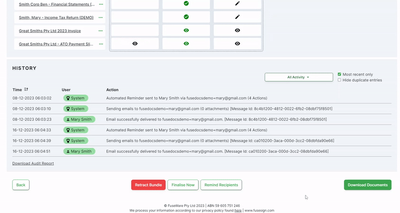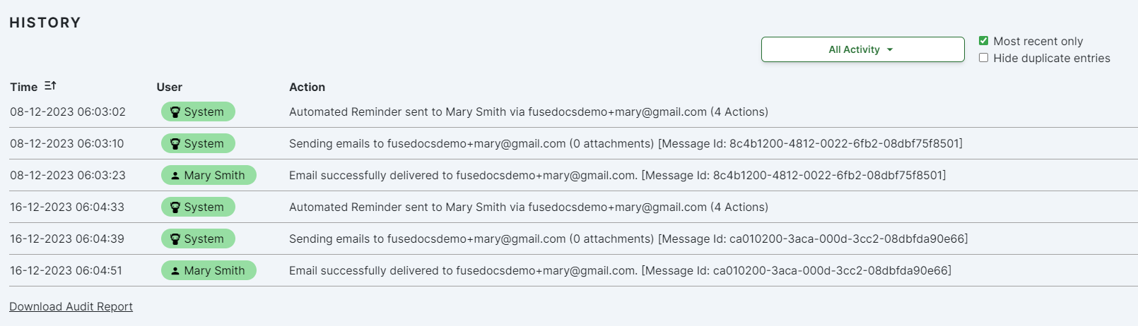 The document audit log is attached to the end of each signed and finalised document. While it also contains a history for the events pertaining to that particular document, it also includes additional detailed information such as recipient details, signature and document IDs, and other verification information. This audit log is essential for compliance and verification and cannot be detached from the signed document.